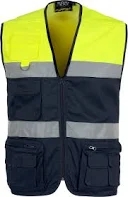 Chaleco tipo safari combinado con cintas reflectantes.Parte superior de alta visibilidad. Escote a pico y cierre de cremallera de nylon. Dos bolsos de pecho de distinto tamaño con fuelle y cartera de velcro.Argolla metálica en el bolsillo superior. Dos bolsos laterales con fuelle y cierre de cremallera. Bolsillos auxiliares superpuestos con cartera de velcro. Dos cintas reflectantes en pecho y espalda. Ribeteado con bies.Composición: Prin. 65% Poliéster 35% Algodón / A.V. 50% Poliéster 50% Algodón